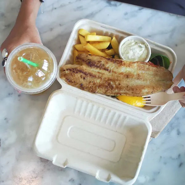 Our plastic-free clamshells are made from rapidly renewable sugarcane pulp, a by-product of the sugar refining industry. Our 9x6x3" natural bagasse clamshell containers are an eco-friendly alternative to plastic takeaway containers.