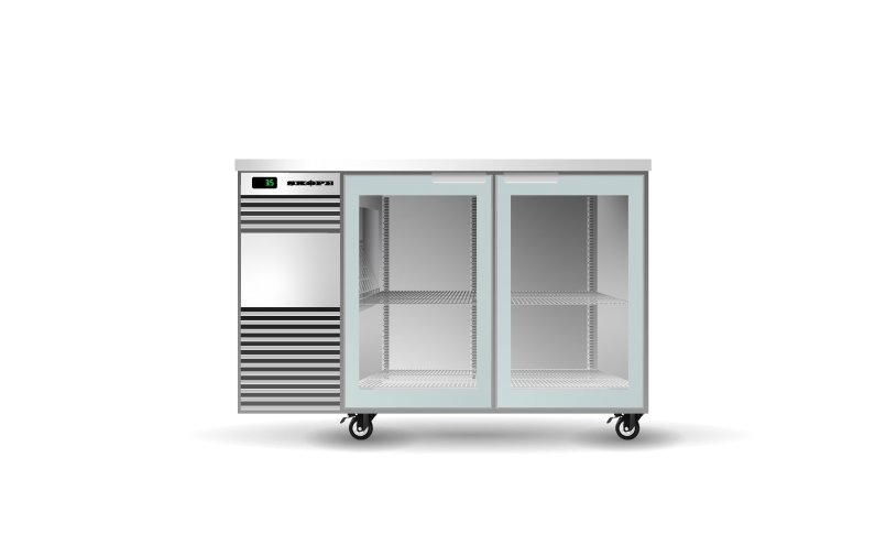Quiet, high efficiency premium two glass swing door bar fridge featuring dimmable LED lights, lockable doors, and eco-friendly natural refrigerant technology.