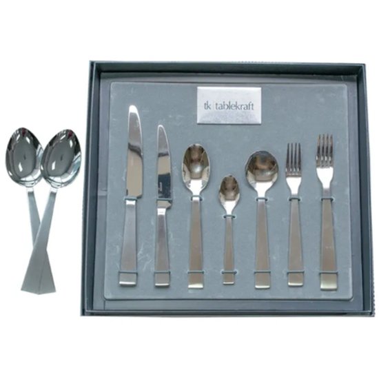 - Set consists of 8 x dessert fork, 8 x dessert spoon, 8 x soup spoon, 8 x teaspoon, 8 x table fork, 8 x dessert knife, 8 x table knife, and 2 x serving spoon