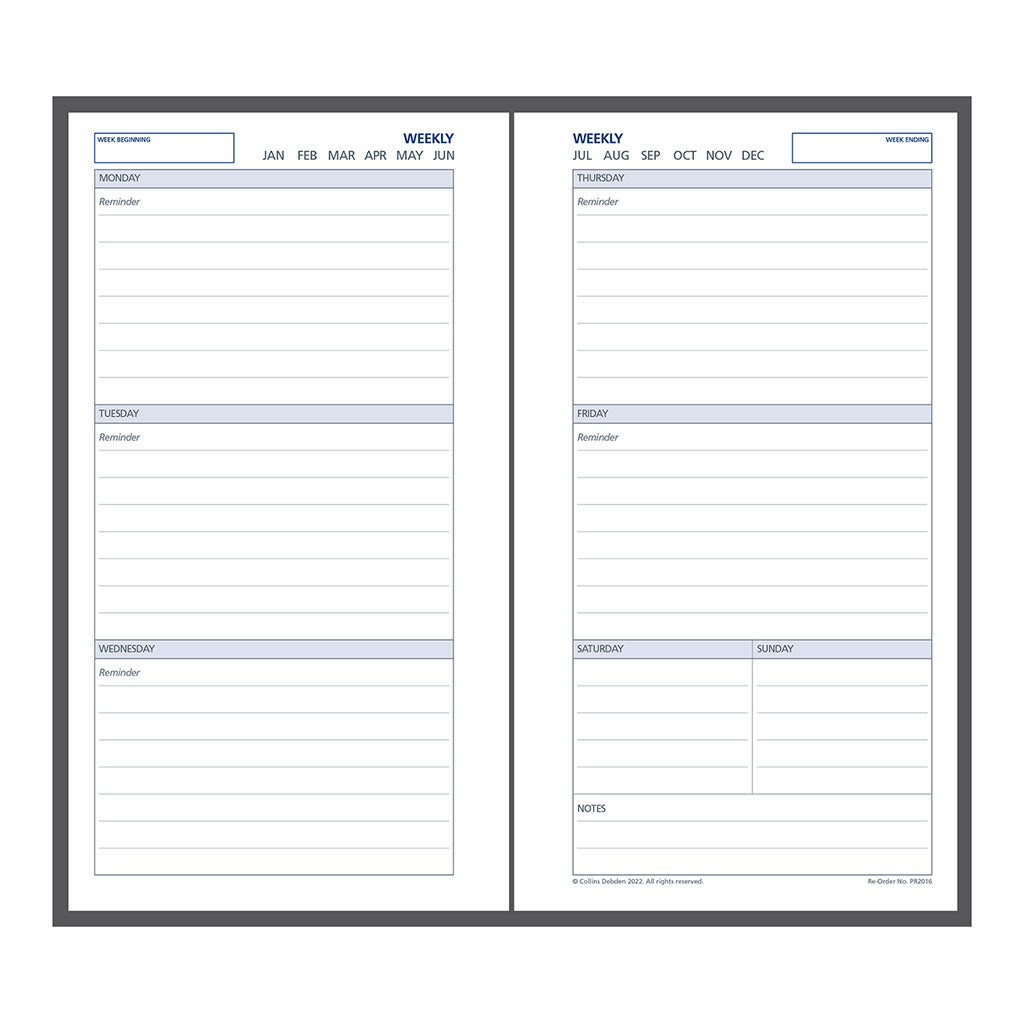 Dayplanner provides a range of accessories and refills printed in two colours on quality white paper. All Debden Dayplanner refills are designed to fit comparable organisers on the market. Suitable for Debden Personal Dayplanner, 6 ring. Undated week to view refill. 30 undated weekly pages.