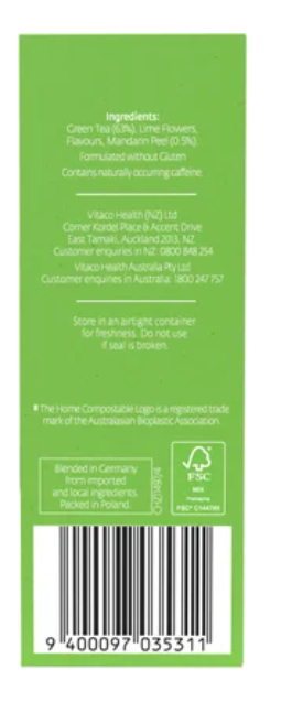 Green Tea (63%), Linden Flowers, Flavour, Mandarin Peel (0.5%)