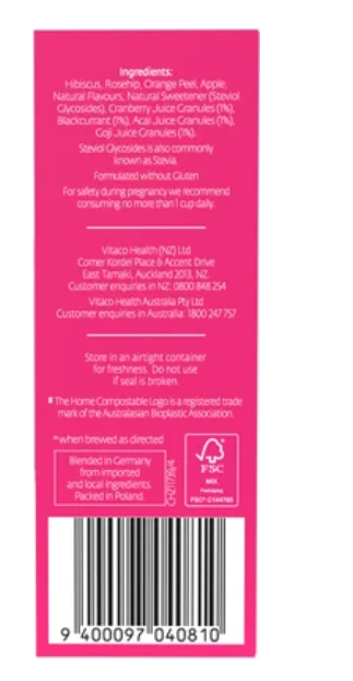 Hibiscus, Rosehip, Orange Peel, Apple, Natural Flavour, Sweetener (Stevirol Glycosides), Cranberry Juice Concentrate Powder (1%), Blackcurrant (1%), Acai Juice Concentrate Powder (1%), Goji Juice Concentrate Powder (1%)