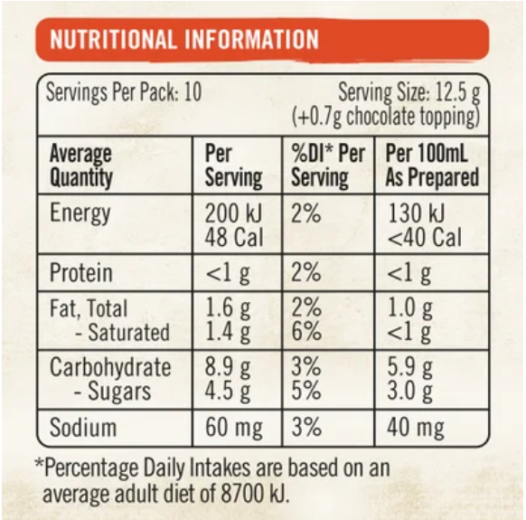 Sachet: Milk Solids, Soluble Coffee (22%), Sugar, Vegetable Oil, Glucose Syrup, Maltodextrin (Corn), Stabilisers (340, 452, 331), Flavour. Chocolate Shaker: Sugar, Cocoa (Cocoa Solids 30%), Emulsifier ( Soy Lecithin), Salt, Flavour (Vanilla), Spice (Cinnamon).