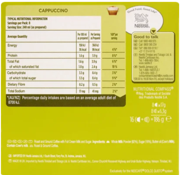 Nescafe Dolce Gusto Cappuccino Coffee Capsules 16pk