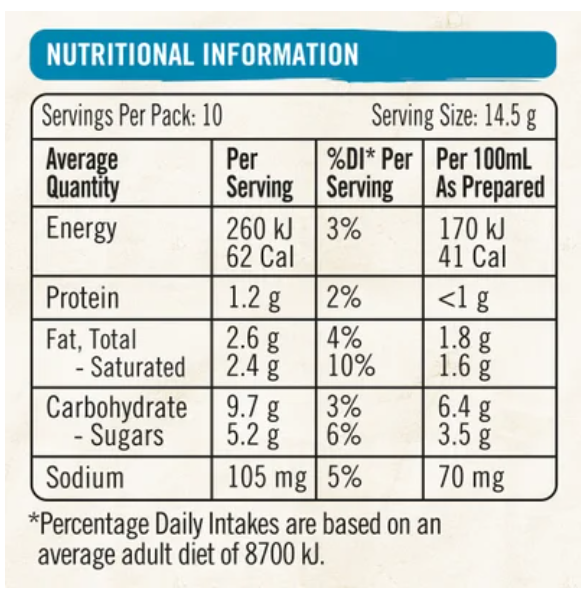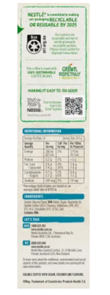 Milk Solids , Sugar, Glucose Syrup, Vegetable Oil, Soluble Coffee (16%), Flavours, Maltodextrin (Corn), Stabilisers (340, 452, 331, 451), Emulsifier (471, 472e), Salt.