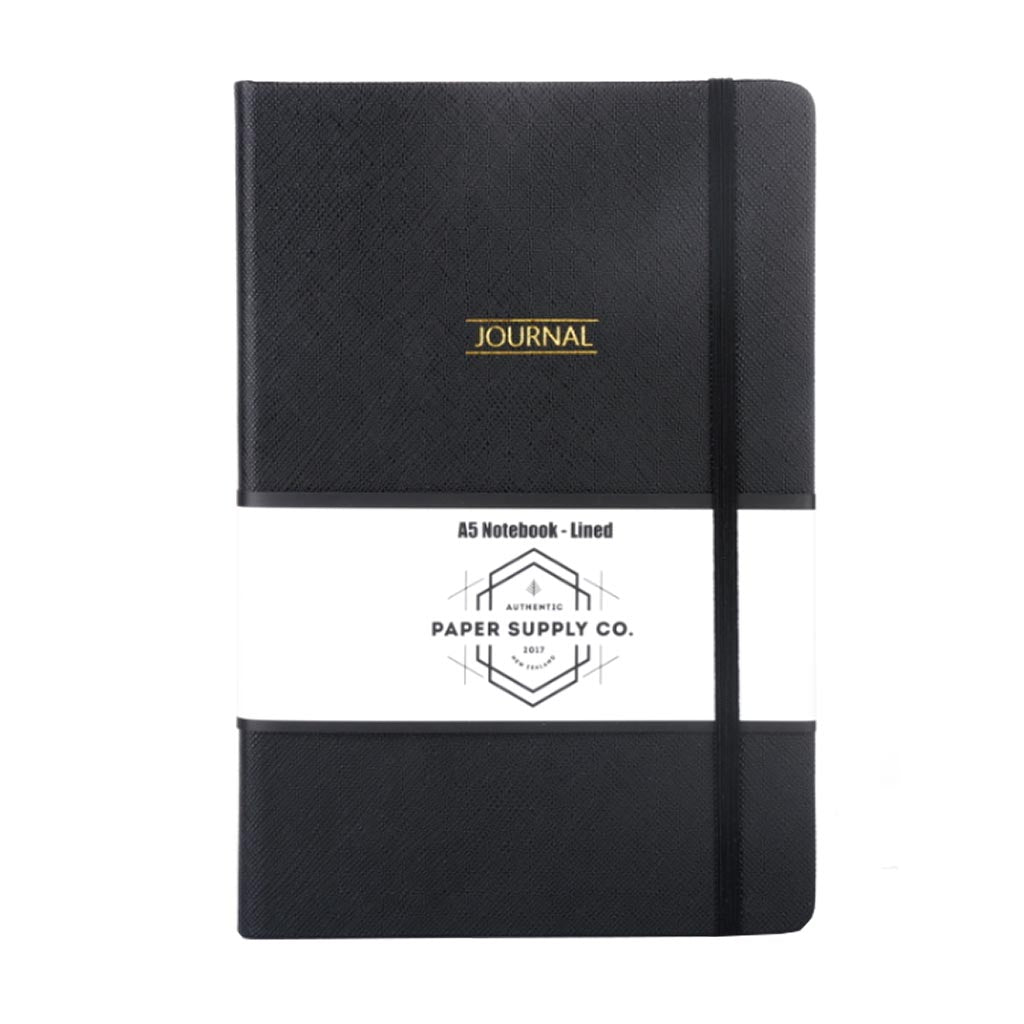 Office Supply Co Citta Journal features a textured hard cover with gold emboss. Elastic closure. 192 lined pages. Black colour. A5 size.