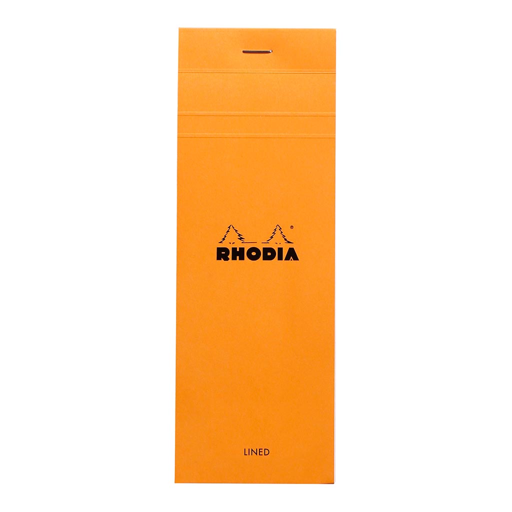 The quintessential pad for anybody using a fountain pen or rollerball, with no bleed-through. The Rhodia Bloc pads are a design classic. The cover is scored so it will fold neatly back over head. Patented double back - no staples exposed to scratch your surface. Microperforated sheets for easy removal. Made with 80gsm PEFC-certified paper. Made in France. No. 8, shopping list size, 7.4 x 21cm. 80 lined sheets. White coloured paper. Orange cover.