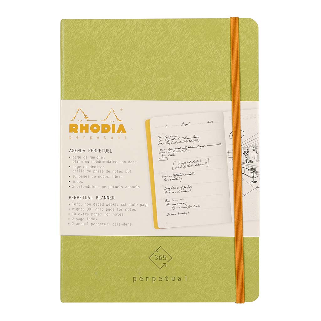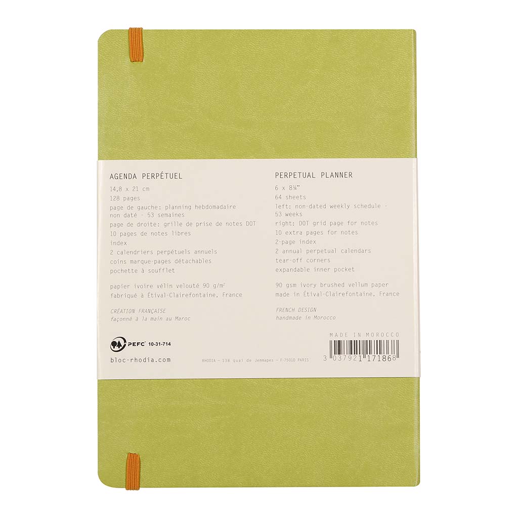 Softcover Rhodia diary with high quality Italian leatherette cover. 2 page index, perpetual calendars. Non dated weekly schedule on the left, with dotted pages on the right for notes. 10 extra dot pages for notes, microperforated bottom corners and expanding inner pocket. 128 pages of 90gsm ivory brushed vellum paper made in Etival-Clairefontaine, France. Anise Green cover.