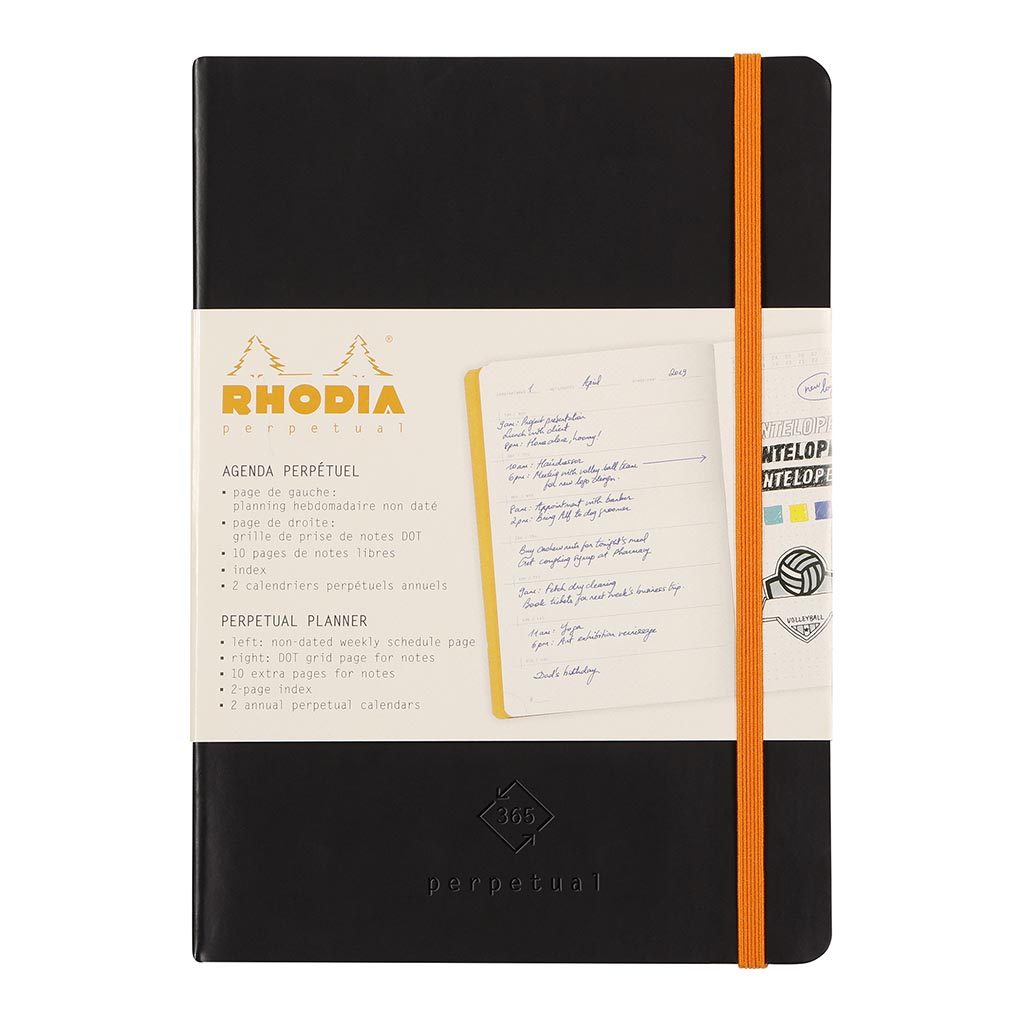 Softcover Rhodia diary with high quality Italian leatherette cover. 2 page index, perpetual calendars. Non dated weekly schedule on the left, with dotted pages on the right for notes. 10 extra dot pages for notes, microperforated bottom corners and expanding inner pocket. 128 pages of 90gsm ivory brushed vellum paper made in Etival-Clairefontaine, France. Black cover.