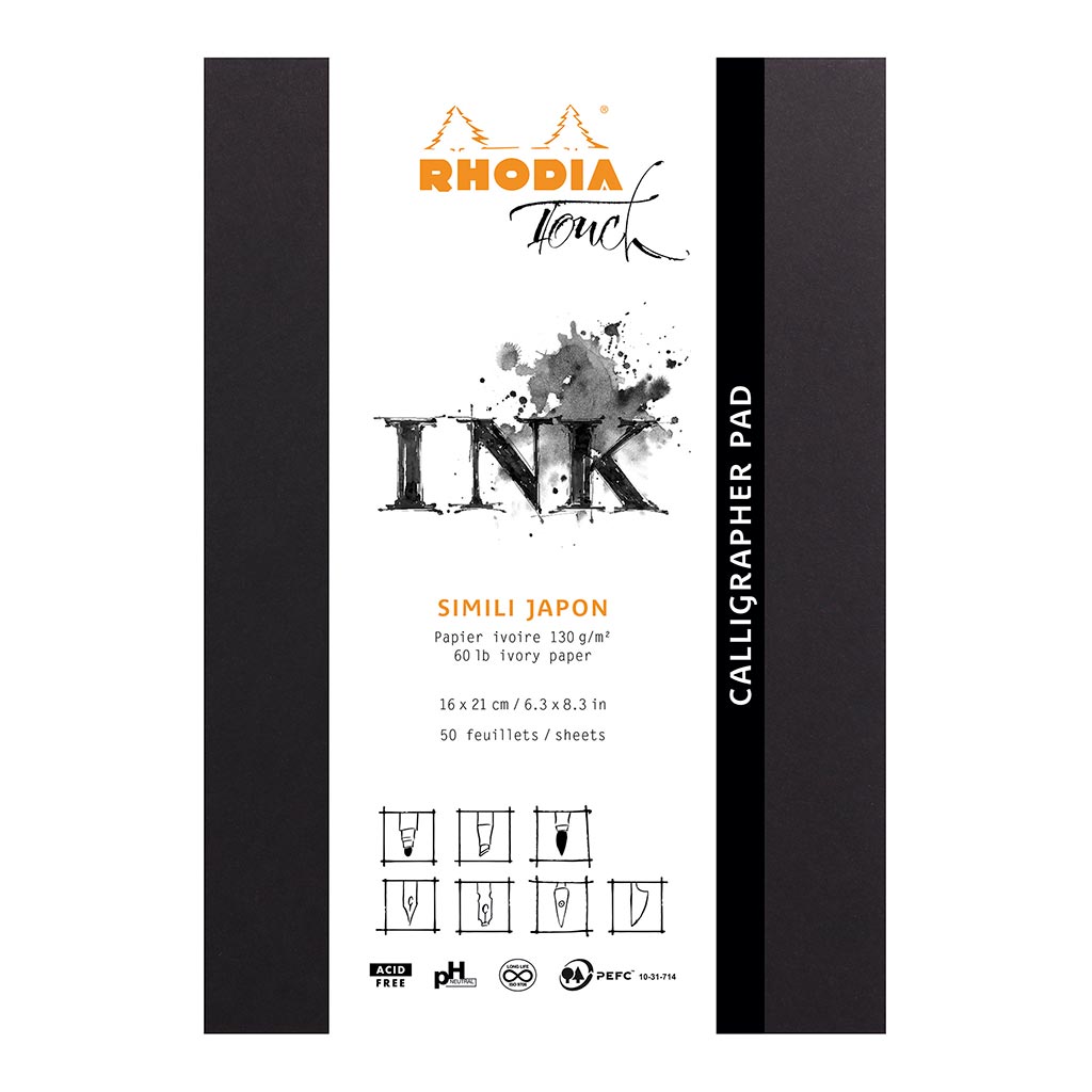 Rhodia Touch is a collection of convenient books and sketchpads designed especially for calligraphers, urban sketchers, designers, architects and illustrators. This range carries the hallmark of excellence, reflecting both our paper making expertise and the Clairefontaine brand’s proven track record and outstanding reputation in fine arts. Features include: Maya black 270gsm cover, glued at the top canvas backed pad, individually shrink wrapped, 50 detachable micro-perforated blank sheets, 130gsm Simili Japon paper. Simili Japan is a smooth, lustrous ivory 130gsm paper made from pure alpha cellulose. It is manufactured with long fibres which make it highly resistant and perfect for India ink drawings. It is transparent and therefore also lends itself well to calligraphy using a scaled grid. A5+ Portrait, Blank, 50 sheets.