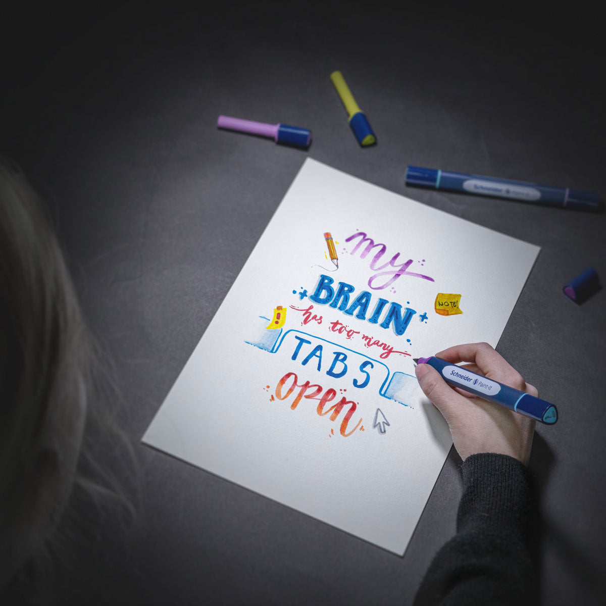 The 30 vibrant colours are ideal for colouring, lettering, and many other creative techniques. The practical cartridge system offers a sustainable painting experience, as every cartridge purchase saves plastic. The cartridges can be easily exchanged without having to empty the cartridges: Unscrew the cartridge, screw in a new cartridge, and start. And that is not all: The Twinmarker is made from 92% recycled plastic. In general, the use of recycled plastic saves 80% CO2 emissions compared to conventional plastic. The water-based, odourless ink delivers stunningly brilliant and colour-intensive results. Colour gradients are also easily possible with the help of the corresponding blender.