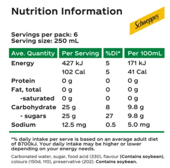 Carbonated Water, Sugar, Food Acid (330), Flavour (Soybean), Colours (150d, 110), Preservative (202)