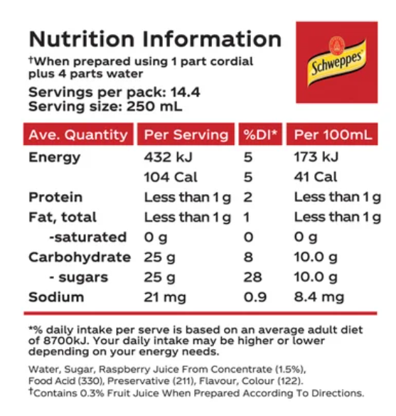 Water, Sugar, Raspberry Juice from Concentrate (1.3%), Food Acid (330), Preservative (211), Flavour, Colour (122)