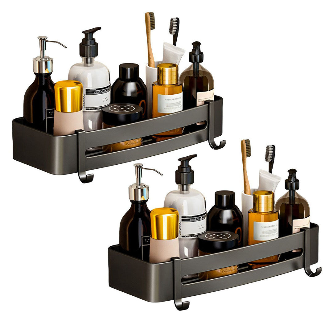 SOGA 2X Black Wall-Mounted Rectangular Bathroom Storage Organiser Space Saving Adhesive Shelf Rack with Hooks