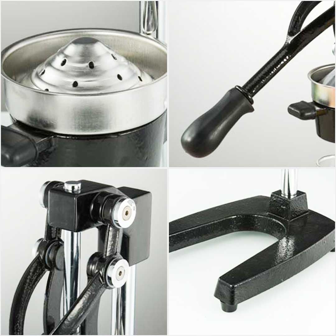 The main body is made of a sturdy cast iron construction base with a food-grade 304 stainless steel strainer and a large opening for juice collecting.