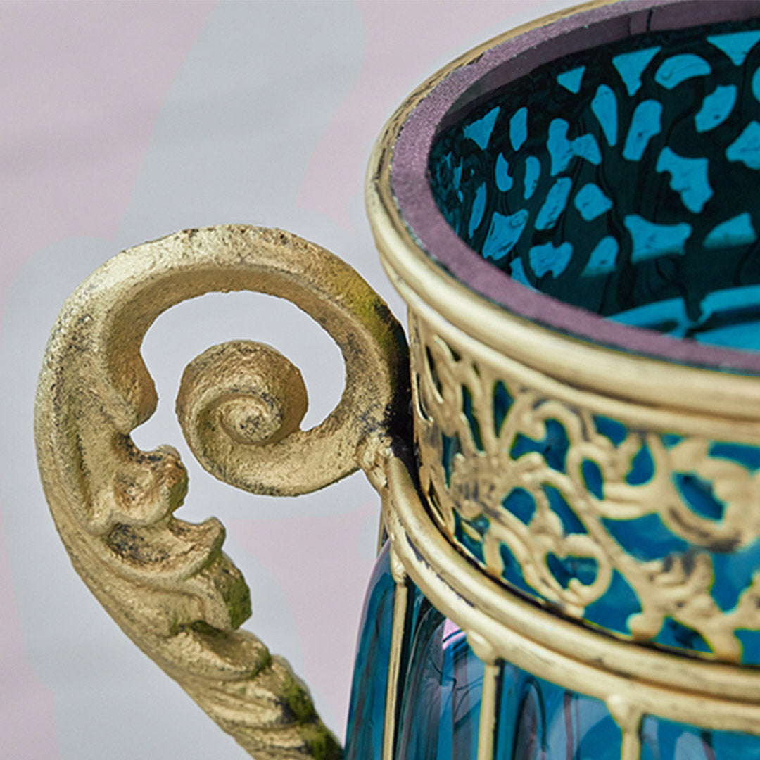 SOGA Blue Colored Glass Flower Vase with 8 Bunch 5 Heads Artificial Fake Silk Rose Home Decor Set
