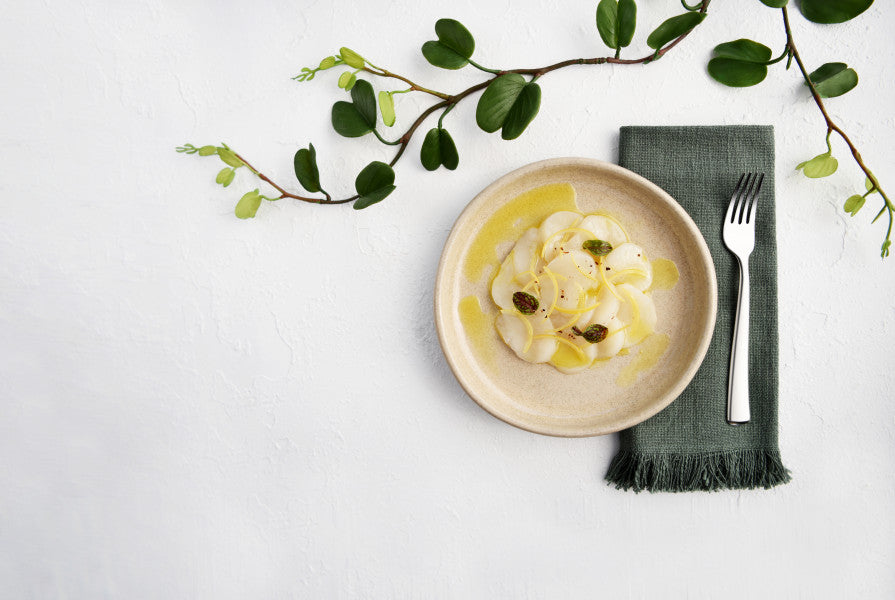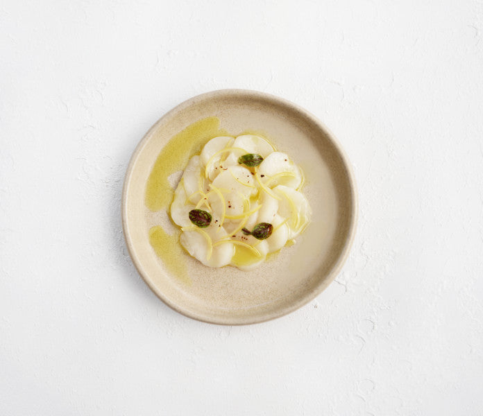 Made of clay that’s malleable and great for forming detailed shapes. Created in a two firing process where it becomes vitrified during the second firing, making porcelain an extremely durable dinnerware option that is dishwasher, microwave, and oven safe.