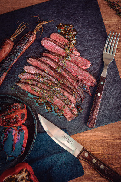 Your barbecue will never be the same again with Tramontina's 12-piece jumbo stainless steel flatware set with brown Polywood handles. This Churrasco line set is made of highly durable stainless steel and the treated Polywood handles add exclusive design to your table and are resistant to shock and high temperatures. The knives offer easy, effortless cutting performance, making the moment of savoring your barbecue even better. Guaranteed satisfaction for your guests.