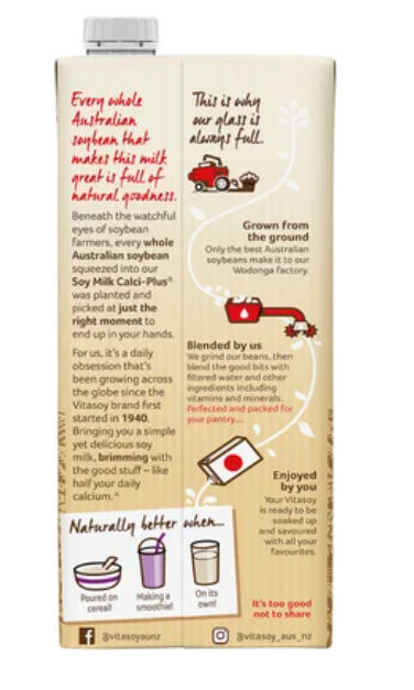 Filtered Water, Australian whole SOYBEANS (min. 15%), BARLEY FLOUR, Raw Sugar, BARLEY MALT, Sunflower Oil, Minerals (Calcium Phosphate, Calcium Carbonate), Sea Salt, Vitamins (Vitamin D, Vitamin A, Vitamin B12, Vitamin B2).